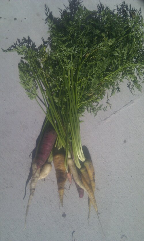 This morning we have been out to the garden and harvested more carrots. I really like this colour mix. I’m in the process of pulling everything except the tomatoes and my giant sunflower out of the garden to make room for more plants, and I’ve decided to plant carrots again. I have purple Dragon carrots and some more colour mix leftover (both from Green Harvest), so hopefully we’ll have further success. I’m also planting at the right time this time, so they should grow a bit faster.