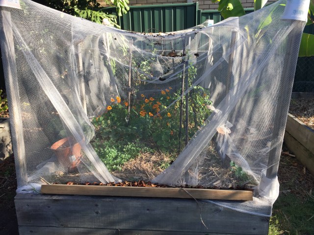 I tried draping shade cloth over the garden bed and growing plants that possums aren’t meant to like. That didn’t work. Finally I bought bird netting, and Tim took some planks of wood leftover from the cubby house and attached them to the garden bed to hold the netting up.